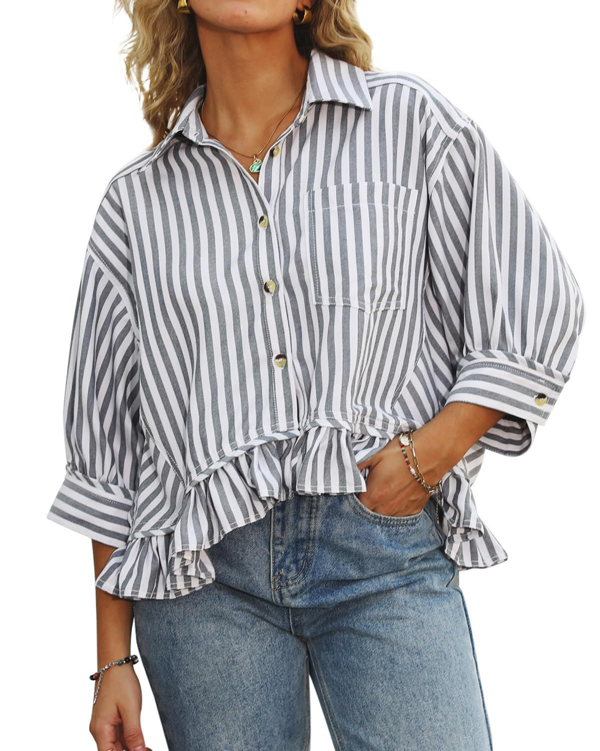 2026 Loose-fitting striped lace hem five-quarter sleeve shirt