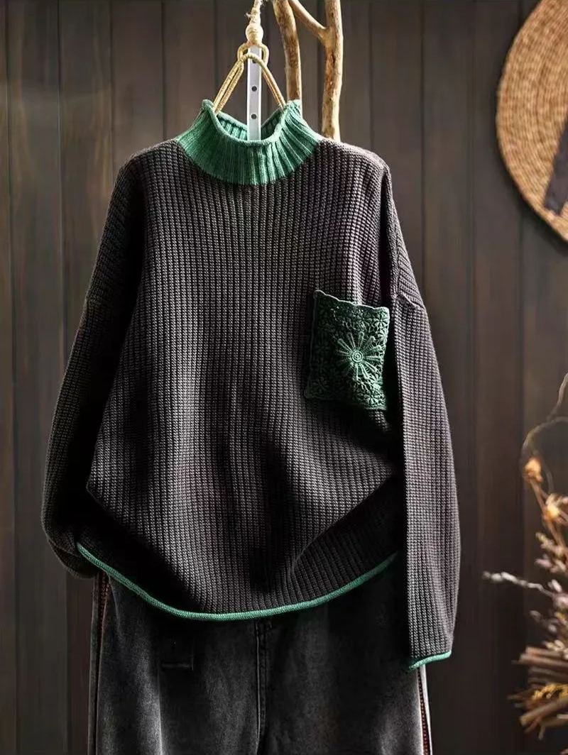 Turtleneck three-dimensional diamond Lace pockets knitted sweater
