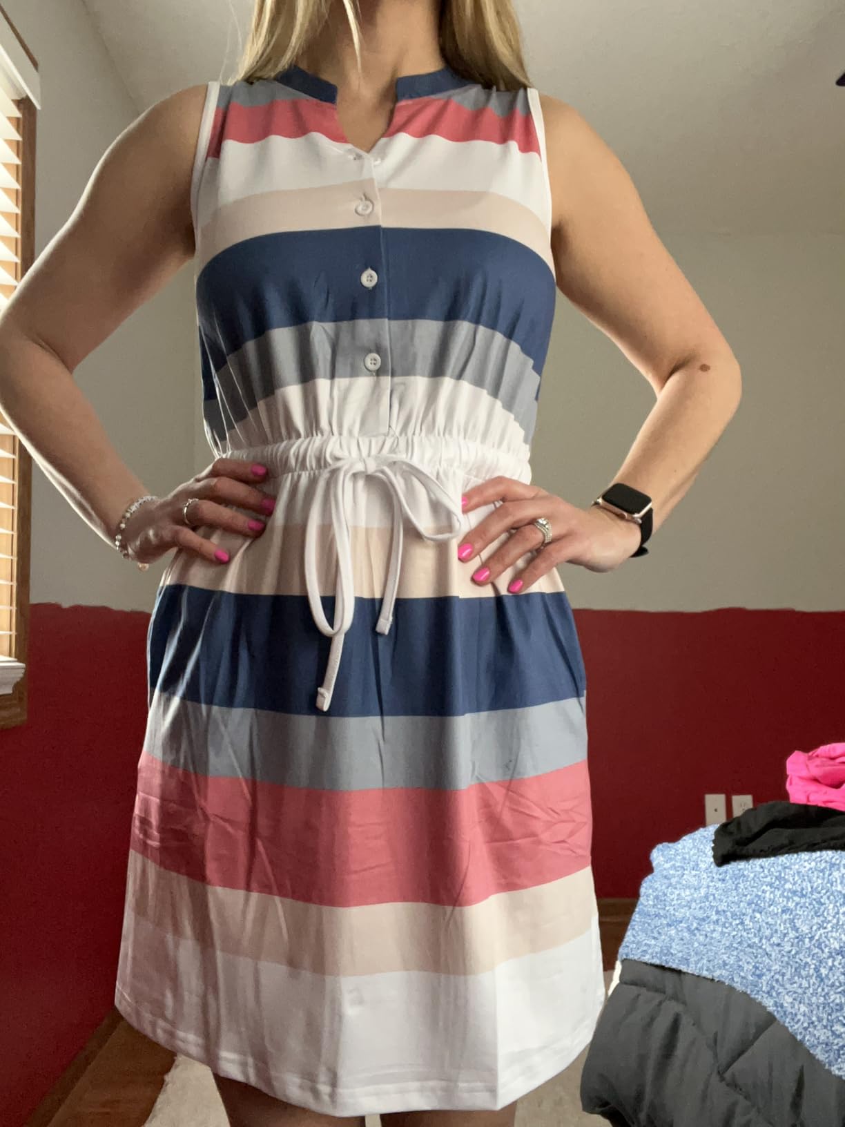 - Features: The summer dress featured in v neck, sleeveless cut, button front design, drawstring waist, knee length, loose fit, and two side pockets. The classic stripe pattern is both stylish and versatile, making it a must-have in your wardrobe