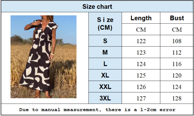 Design: Printed pattern, short sleeves, full hem, loose fit, V-neck, long dress, flowing skirt, floor-length design, relaxed fit. This flowing resort dress will make you stand out from the crowd and show off your graceful figure.