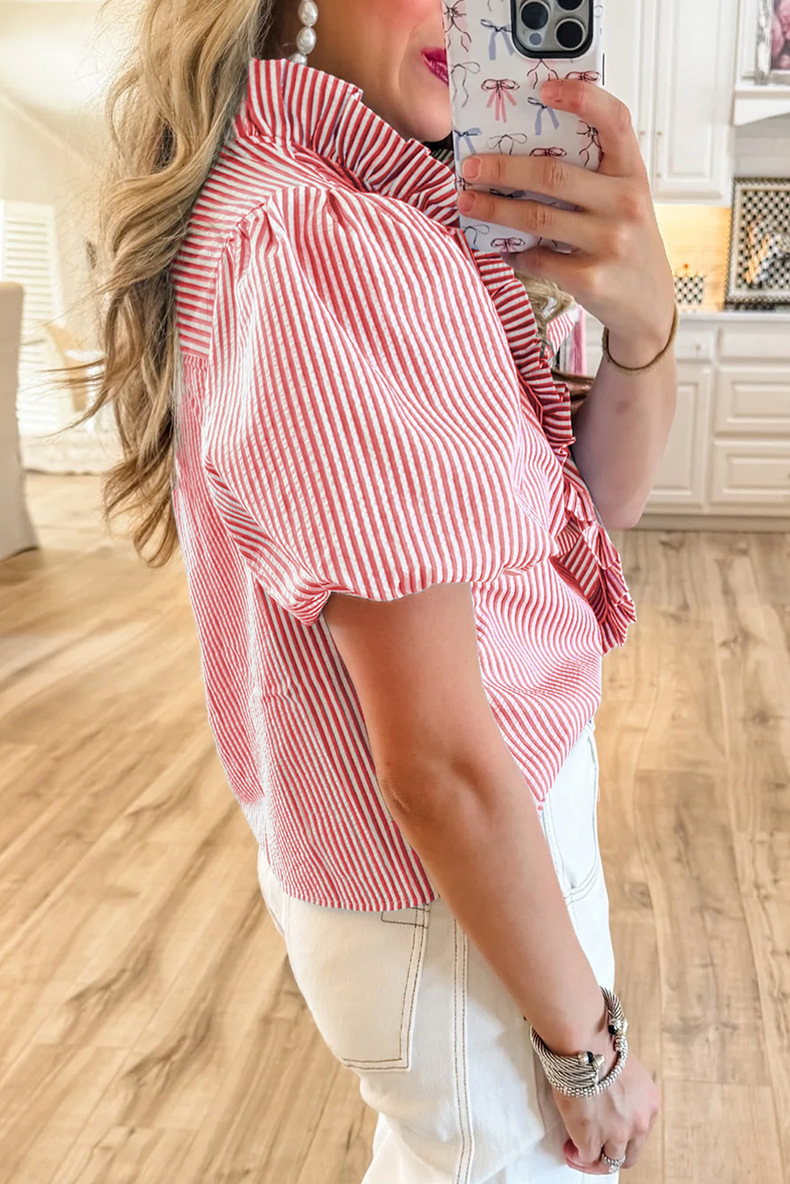 - Features: High-quality ruffled button-down shirt with a striking blue and white striped design, featuring a ruffled stand-up collar and a row of buttons with matching ruffles, simple yet stylish. Made of pure cotton, this fashionable long-sleeved shirt is suitable for autumn/spring/summer wear, offering simple comfort. Ruffled button-down shirts are a trendy autumn fashion item, showcasing feminine charm.