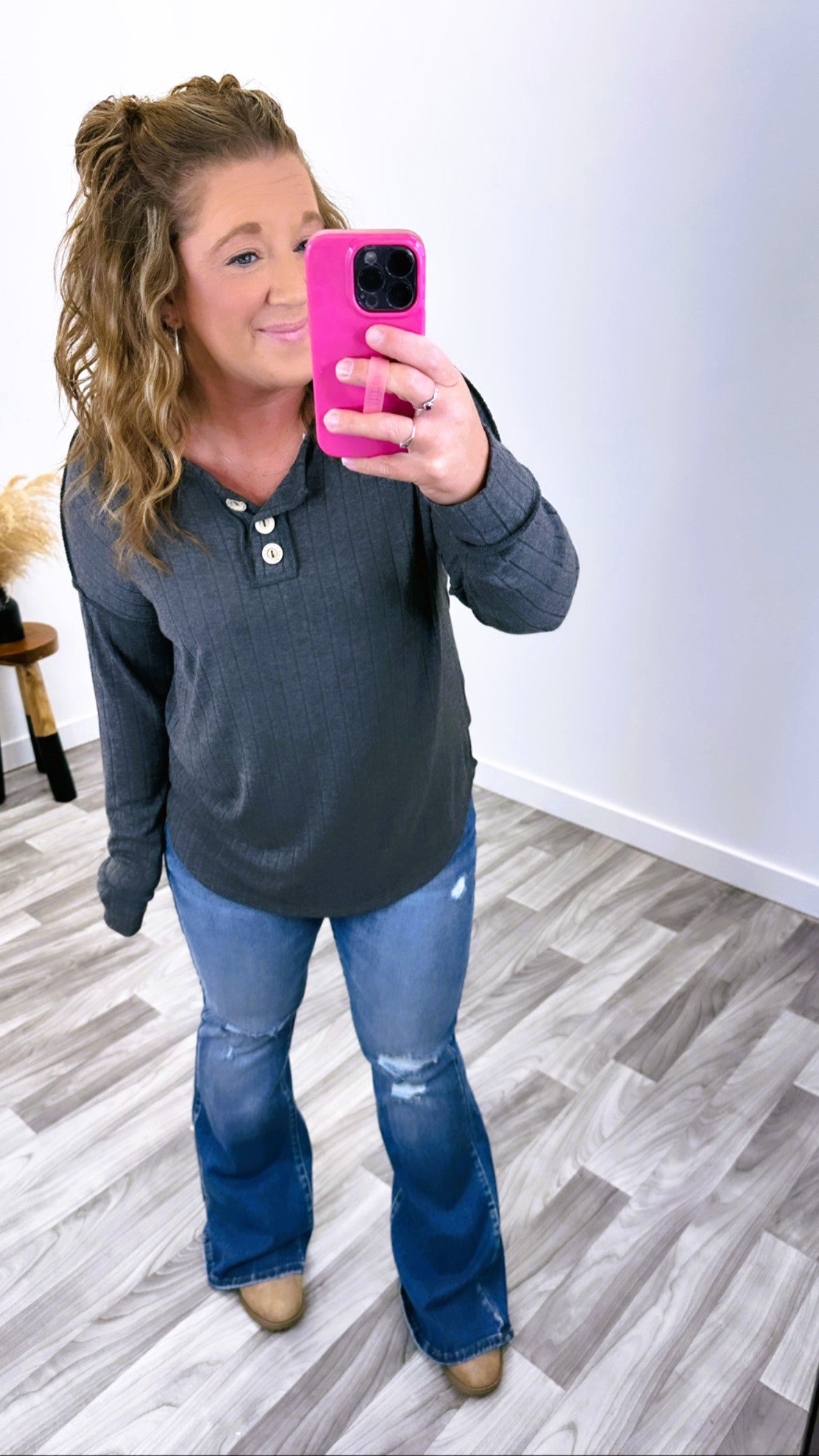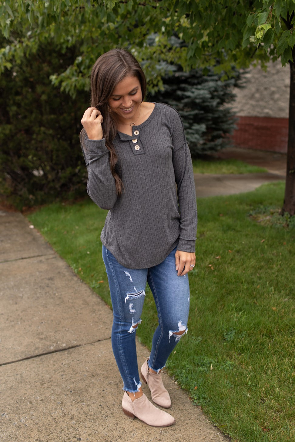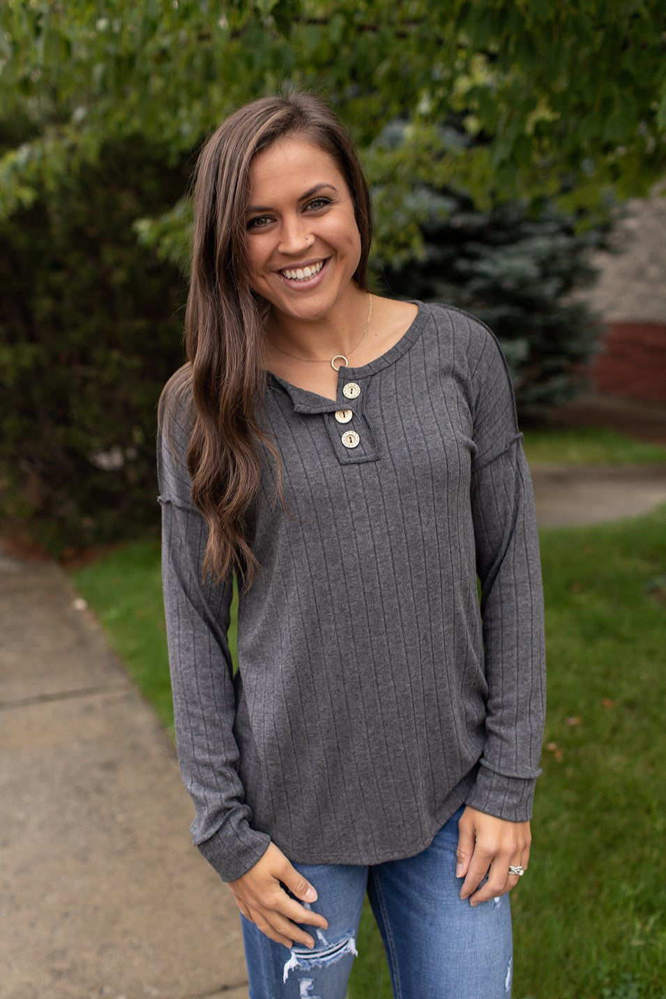Soft & stretchy ribbed charcoal gray long sleeve. Exposed seams. Button details at the chest(not functioning).