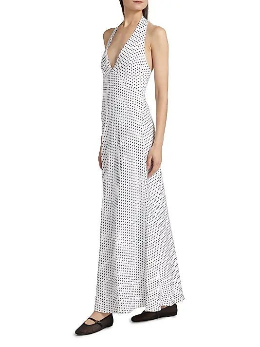 Crafted of linen, the Delilah halterneck maxi dress from Reformation features a polka dot print and is cut in an A-line silhouette.