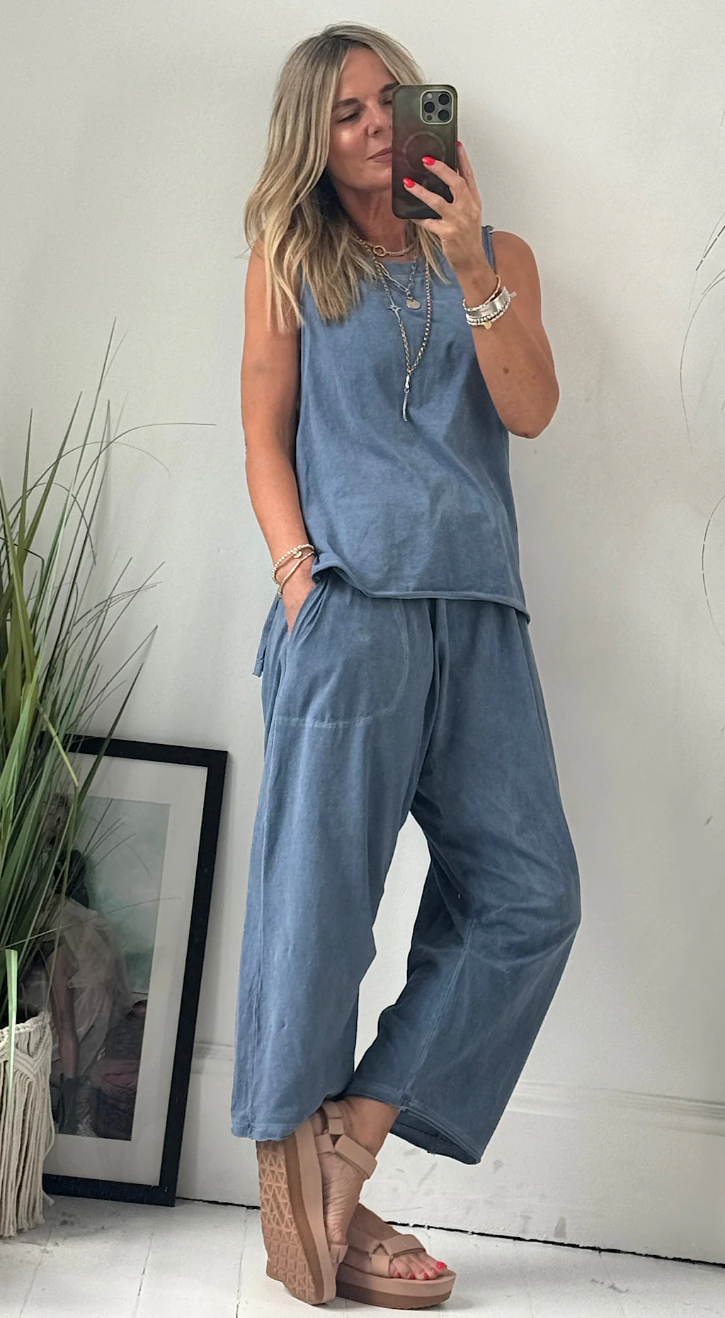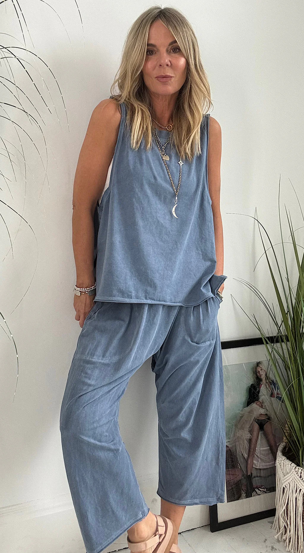 - this washed co-ord set features a sleeveless relaxed-fit top and wide-leg trousers with an elasticated waist. Crafted from breathable, soft-touch fabric, it's the perfect blend of laid-back and luxe. Ideal for lounging, travel, or warm summer days.