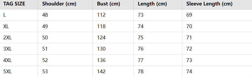 Size: L, XL, 2XL,3XL,4XL,5XL