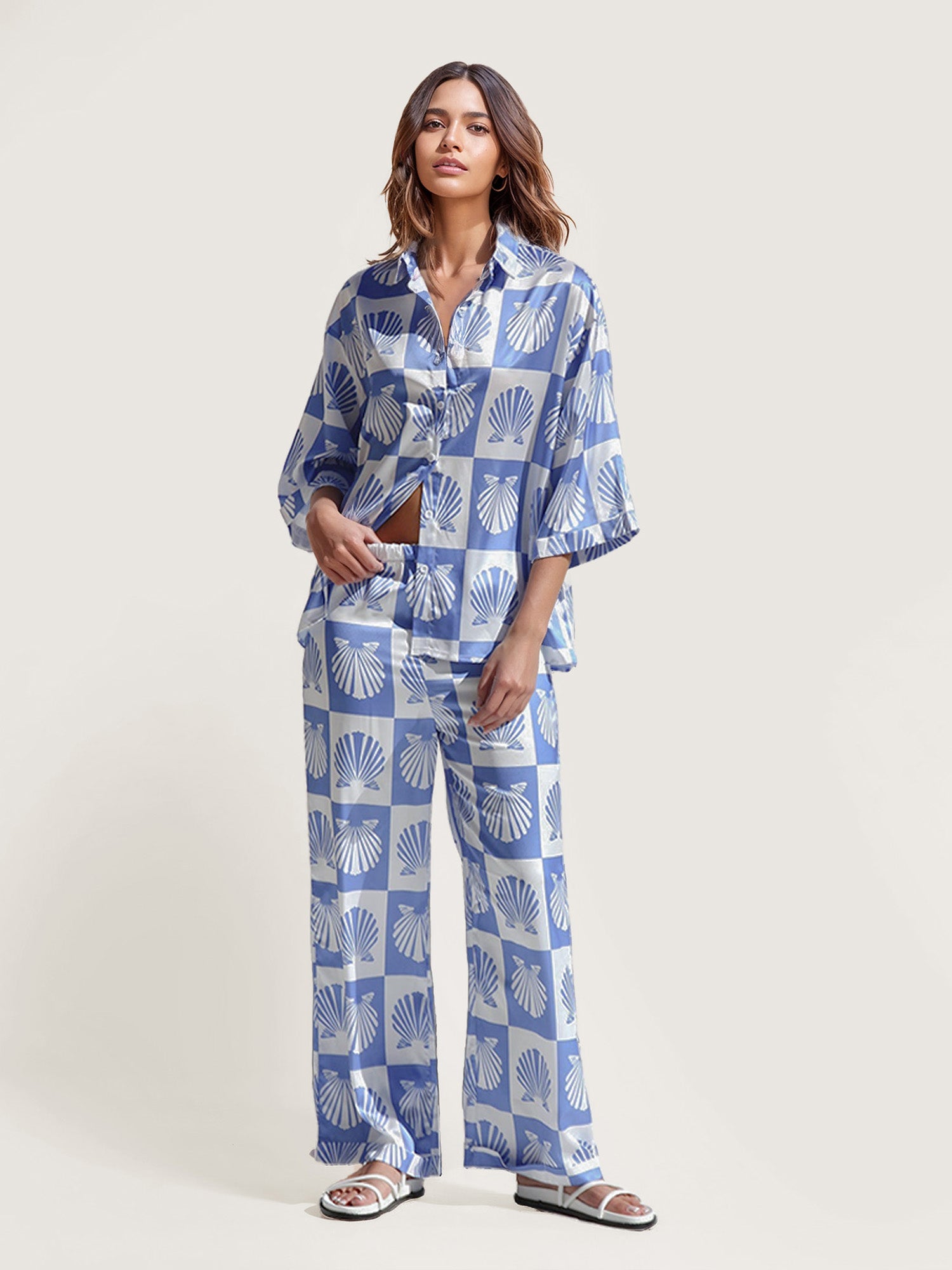 The Seashell Dreams Oversized Button-Down Shirt brings coastal elegance to your wardrobe with its relaxed fit and soft blue shell pattern. Designed for effortless style, this oversized shirt is perfect for casual outings or beachside relaxation. With its timeless design and laid-back silhouette, it pairs seamlessly with your favorite accessories for a chic, relaxed look.