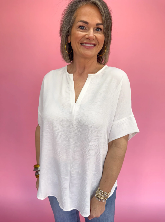 Introducing our Run The World Top! Perfect for any occasion, this versatile wardrobe essential features a lightweight and breathable crinkle fabric, a flattering v-neckline, and a stylish pleat down the front. With its wide hem on the sleeves this top is an effortless addition to your spring wardrobe. It is available in an array of colors that will perfectly take you from a weekend with the girls to work at the office!