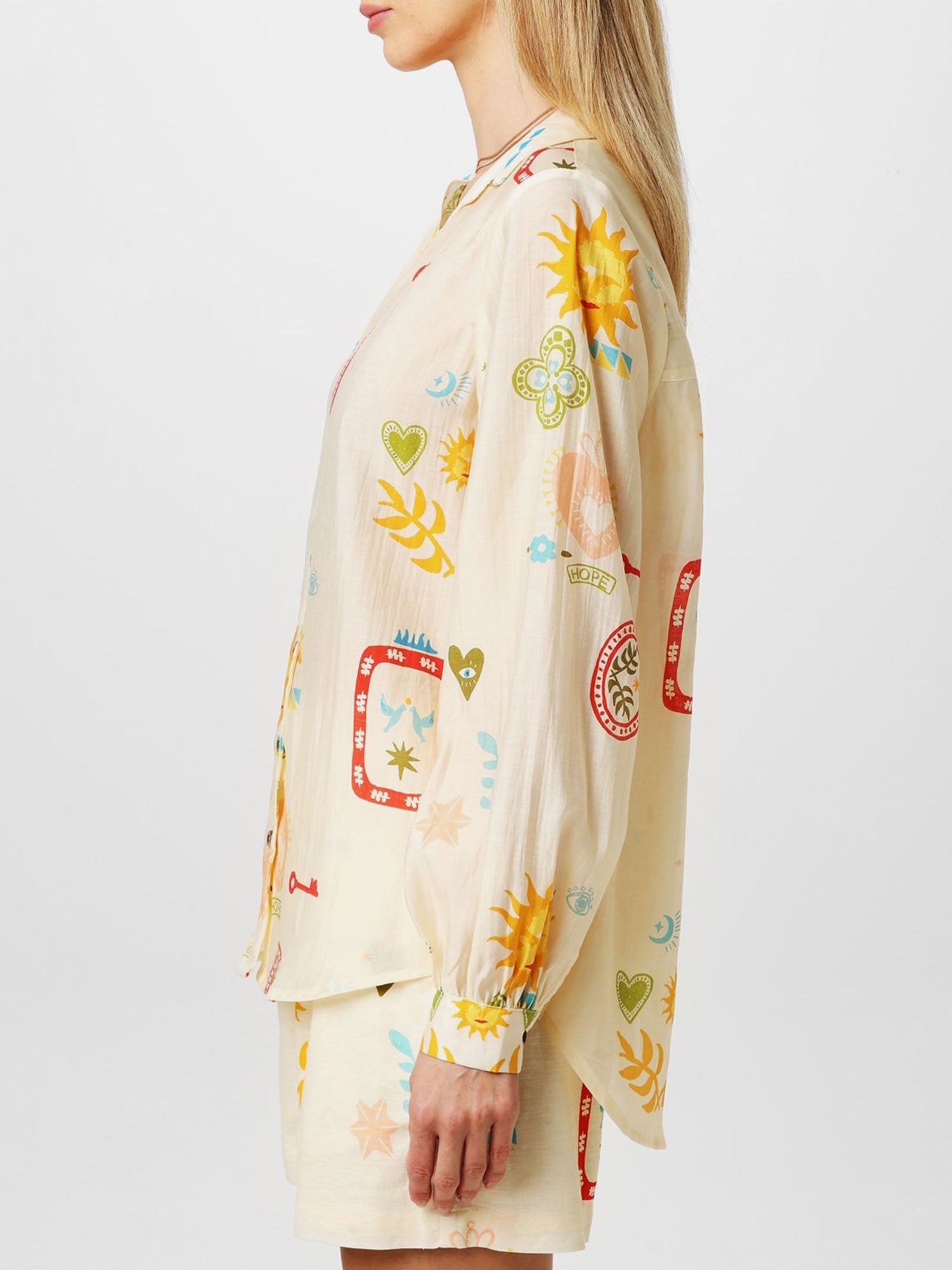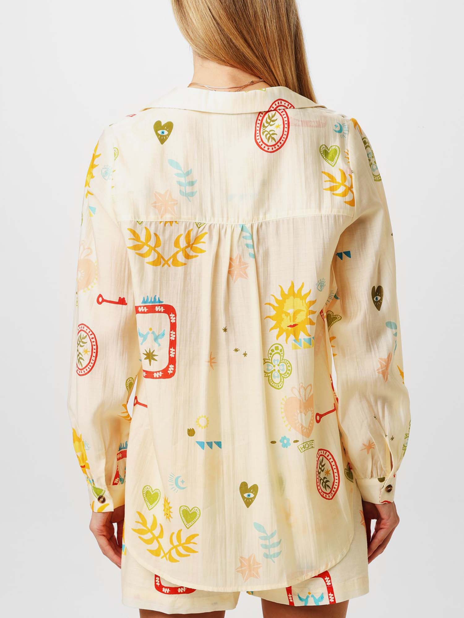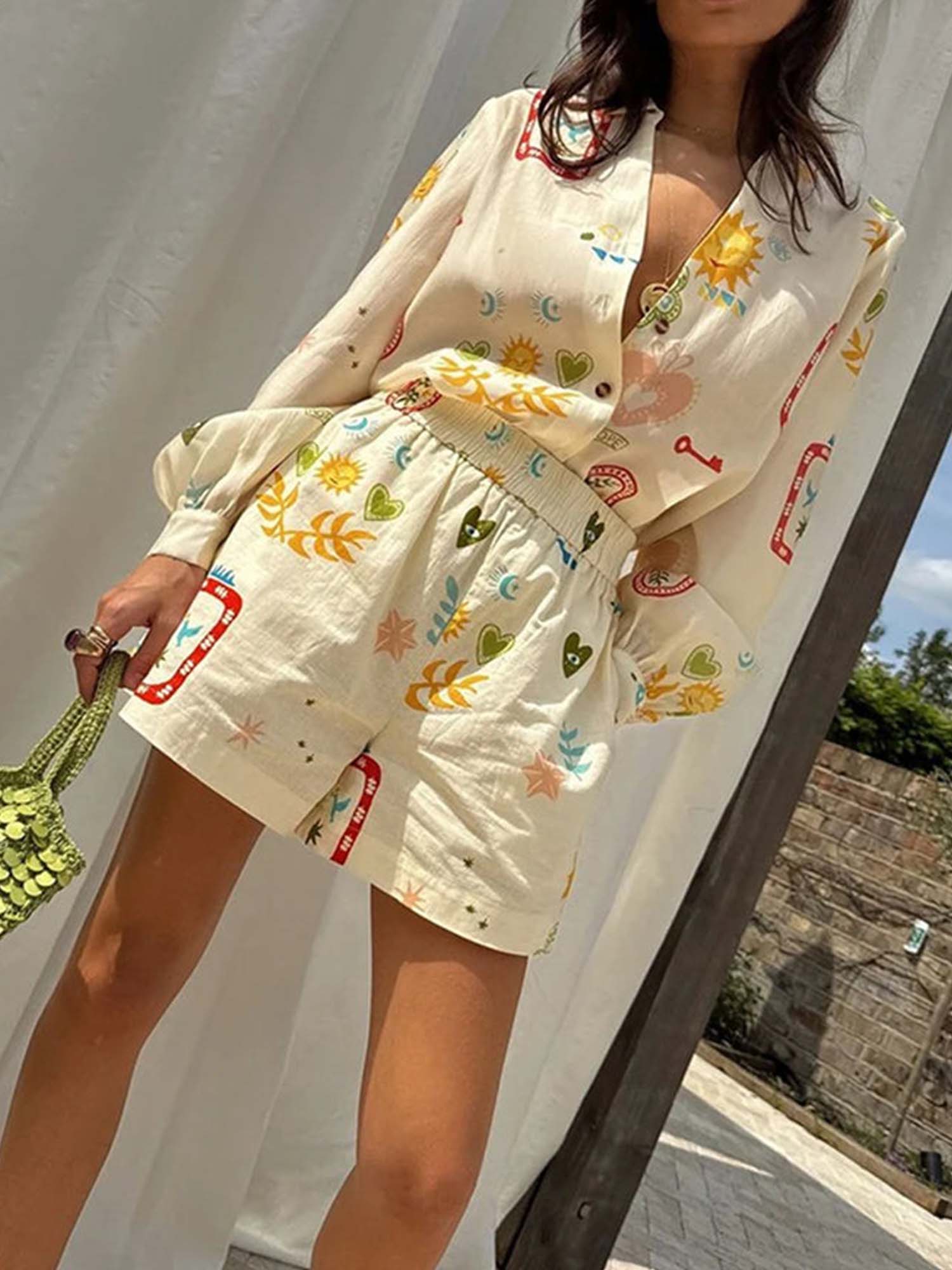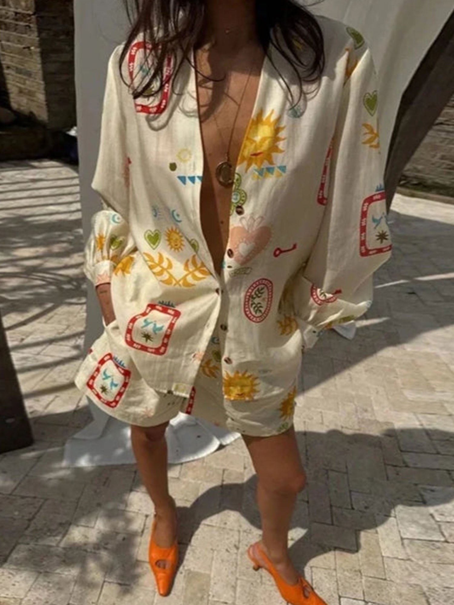A blend of elegance and comfort, this lightweight set features a whimsical celestial print with golden sunbursts. The relaxed pajama-style shirt paired with breezy shorts makes it an ideal choice for both casual outings and stylish lounging.