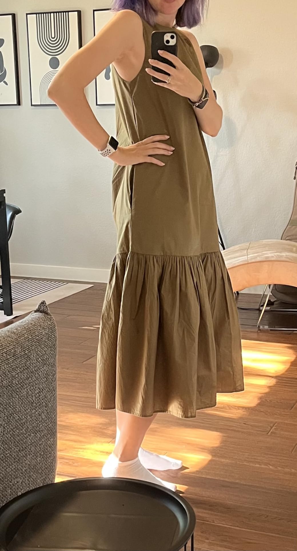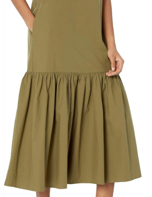 - Keyhole button closure at back neck, side slit pockets, and a voluminous tiered silhouette.