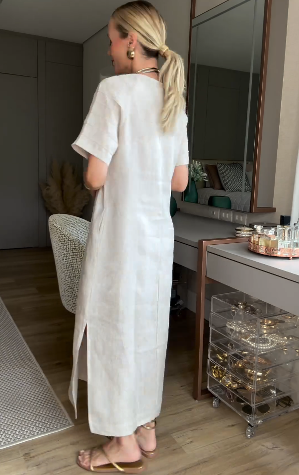 Women's Short sleeve Cotton Linen Skirt Dress With Pocket