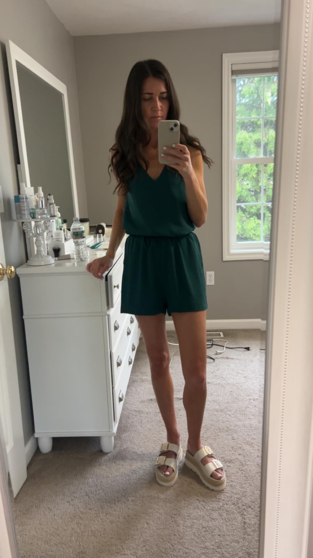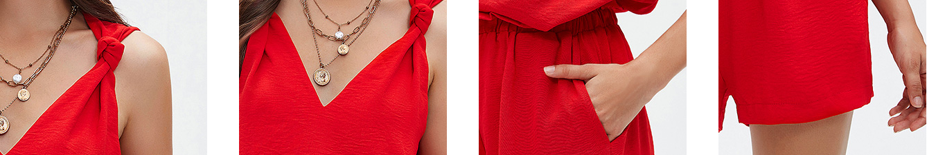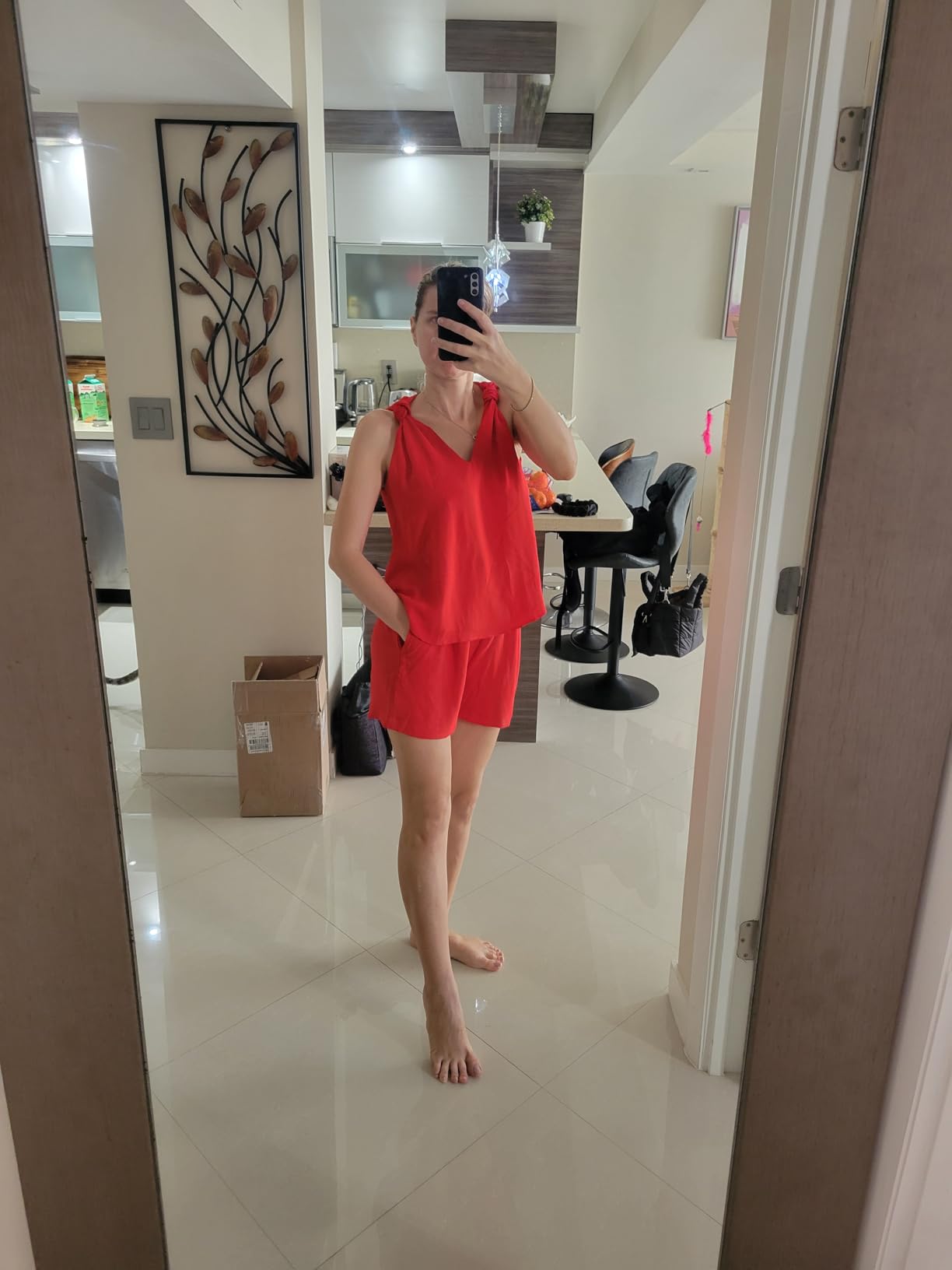 I really like this outfit because the shorts are the perfect length. The shorts fit really well, they are the perfect length, they have elastic at the waist, and they have pockets! The top is true to size. I like this outfit because it is lightweight and looks chic, and the knotted shoulder design adds to the appeal