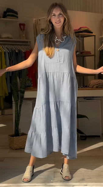 Design: Relaxed, A-line silhouette with subtle tiered layers for a graceful flow.
